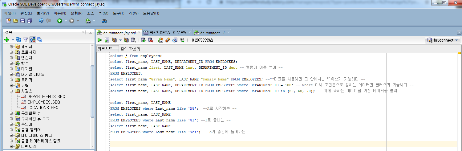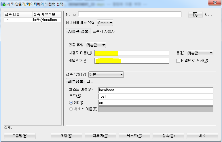 Intro(2)에서 활용했던 사용자 이름 : hr과 그때 설명한 비밀번호를 입력해 해당 데이터베이스에 접속하도록 한다.