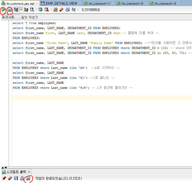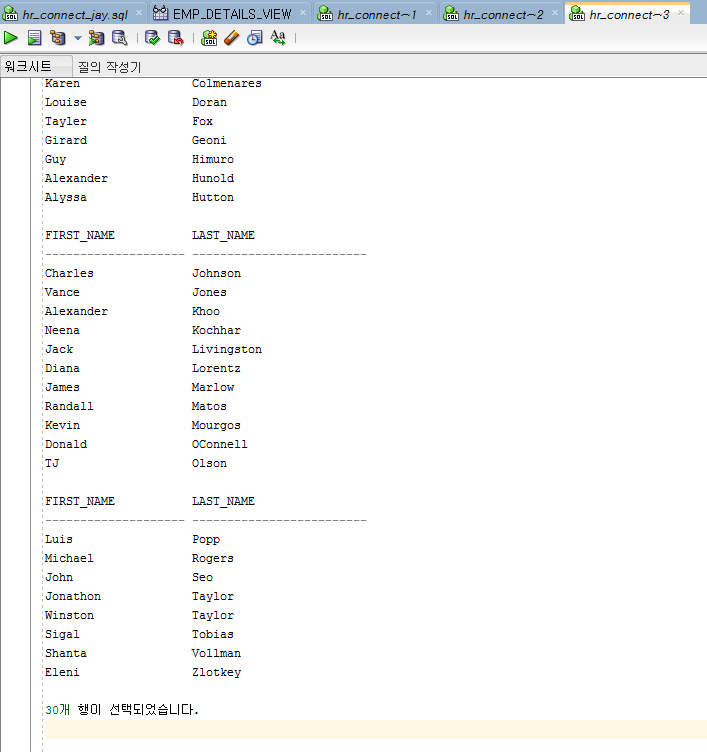 해당 구문에 대한 출력결과를 확인해보았다. 마지막 출력 결과를 보면 이름 중간에 o가 들어가는 이름들이 잘 선택된 것들을 볼 수 있었다.