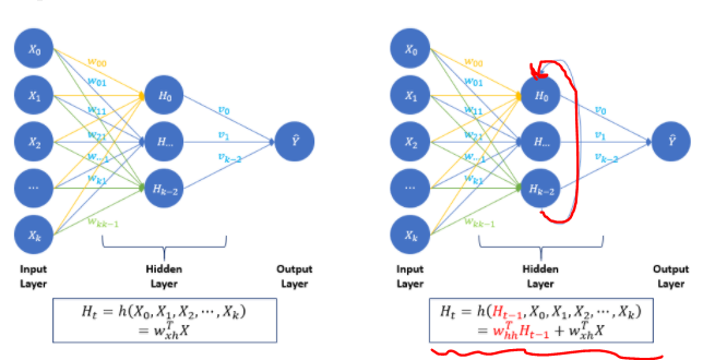 - 은닉층 노드를 공통으로 사용하여 이전 상태를 반영한 가중치 갱신이 가장 큰 특징.(그림 우측)