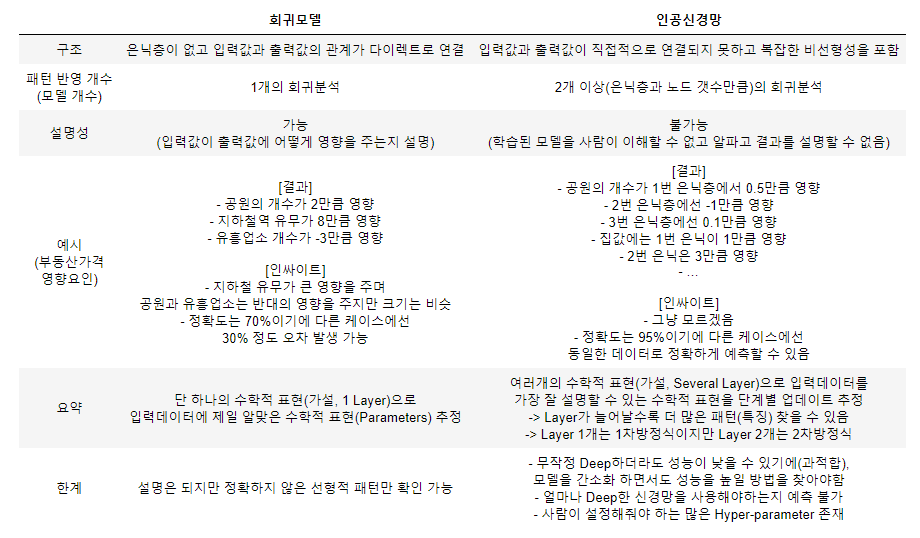 - 인공신경망은 입력과 출력이 직접적으로 연결되지 않기 때문에 비선형성을 포함하며, 구성된 층만큼 더 다양한 패턴을 학습(회귀)할 수 있다. 그만큼 회귀모델보다 나은 성능을 보이지만 설명 가능 정도는 그만큼 떨어진다.(어느 층에서 어떻게 영향을 주는지 추측하기 어렵다; Black box)