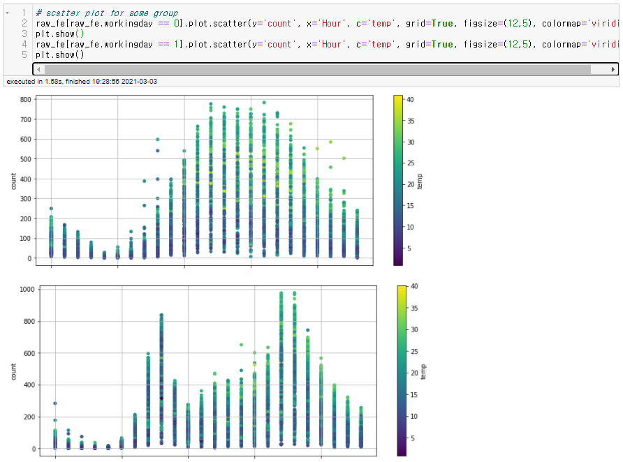 휴일일 때와 그렇지 않은 때의 분포가 확연히 다르기 때문에 휴일 여부가 분석에 큰 도움이 될 거라 미루어 볼 수 있습니다.