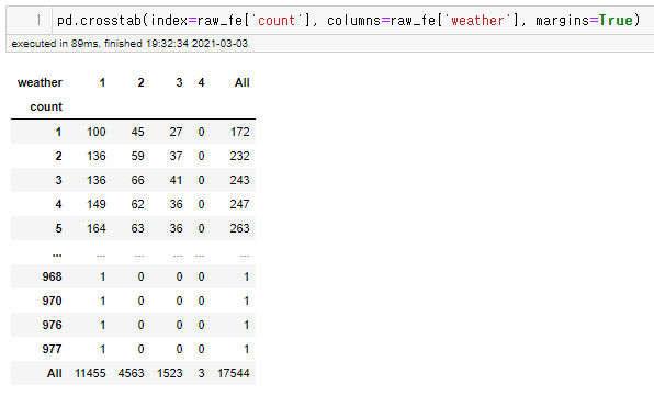 엑셀에 있는 크로스탭 기능처럼 축에 변수를 지정해 교집합이 되는 데이터의 숫자를 확인.