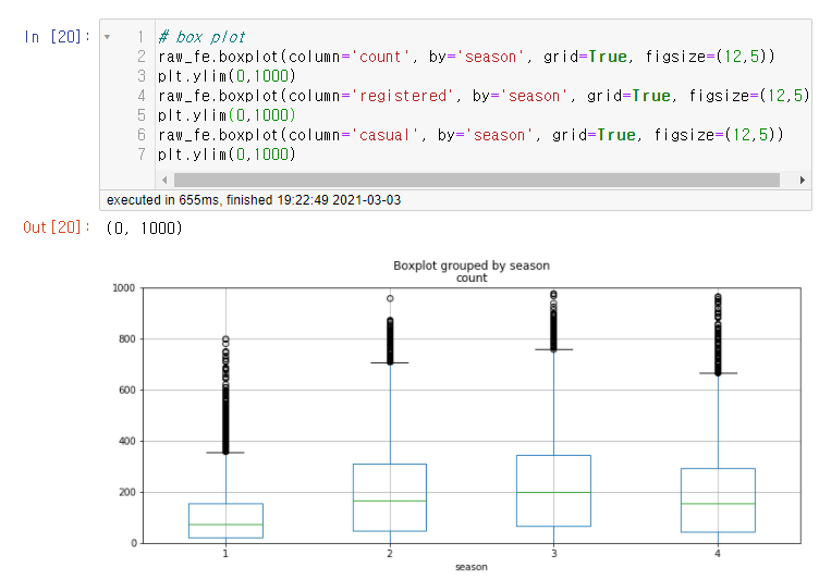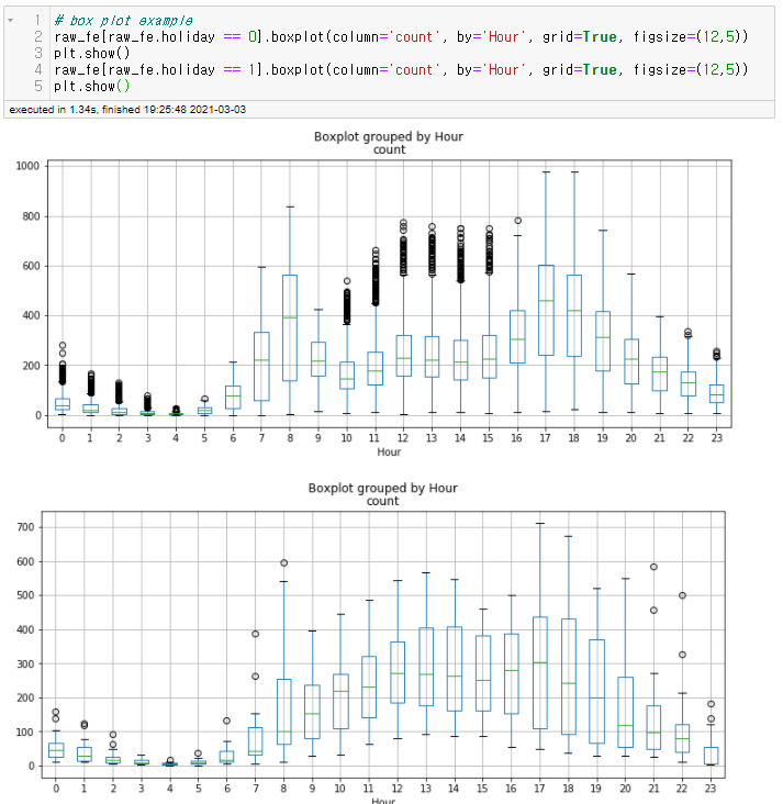 holiday == 0 옵션을 통해 휴일 구분을 한 데이터를 시간별로 박스 플롯을 그려보았습니다.