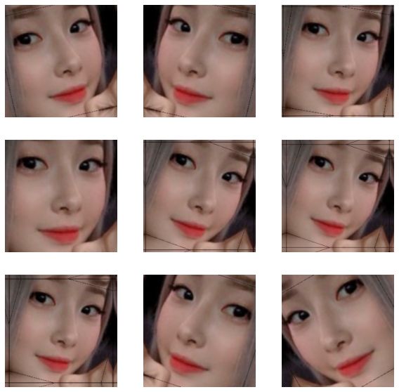 전체적으로 이미지가 적기 때문에 trainset에 대해서 증강 기법을 이용했습니다. 적용한 방법은 다음 3가지입니다. 가능한 얼굴 이미지의 특성을 해치지 않는다고 판단한 방법만 적용한 것이 특징입니다. 그리고 증강 예시는 다음 이미지와 같습니다.