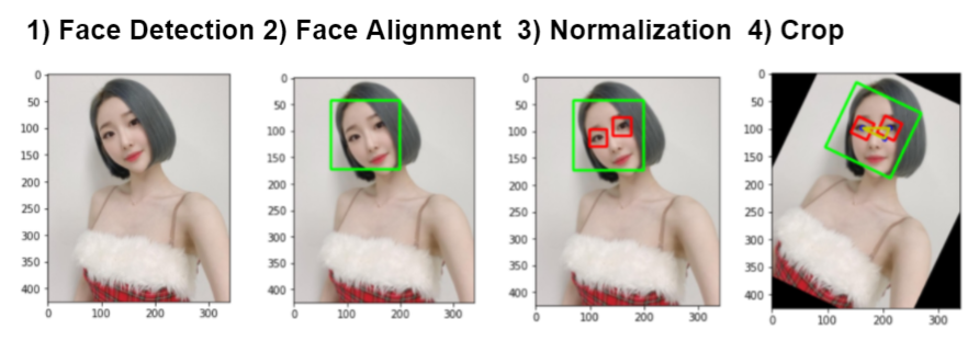 이미지에서 '얼굴' 부위에 해당하는 부분을 box로 감지합니다. 그리고 얼굴의 요소 눈, 코, 입 등을 감지하는데요, 이를 기준으로 얼굴을 정렬해 정면을 바라보게 하는 정규화를 수행합니다. 그리고 정규화된 영역을 잘라내서 따로 저장하면 전처리가 마무리됩니다.