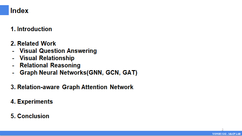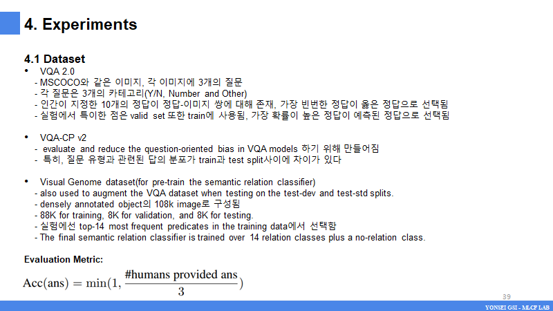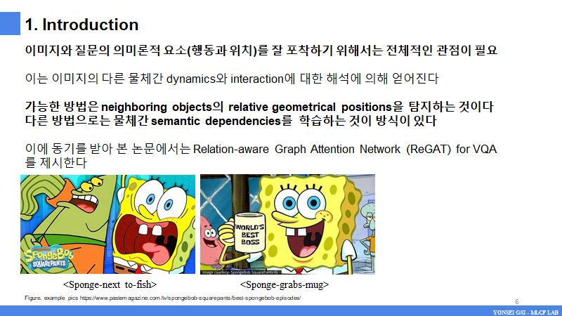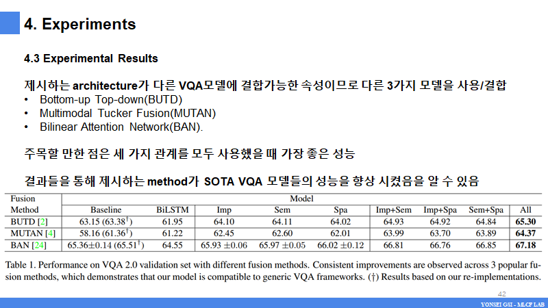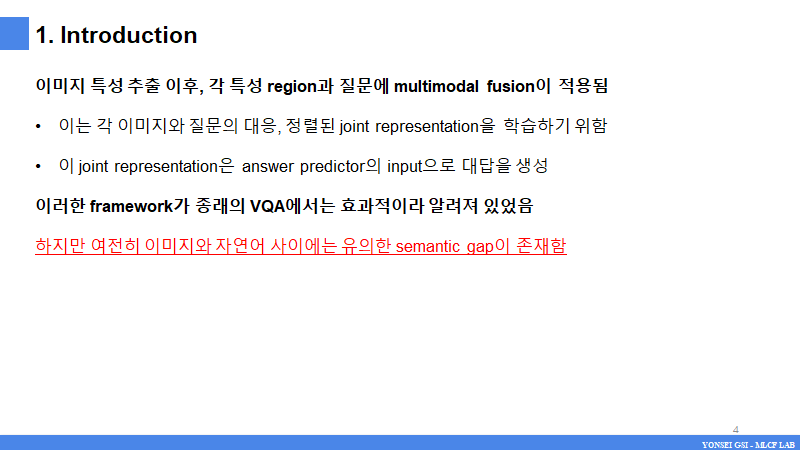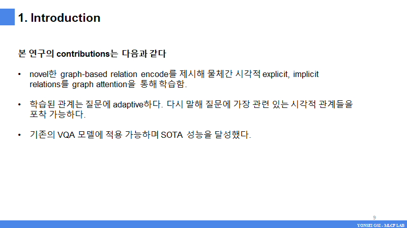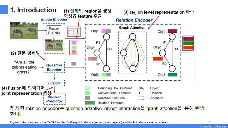 - 이 relation aware visual feature와 question embedding이 multimodal fusion module에 입력되어 질문을 예측하는데 쓰이는 joint representation을 생성합니다.