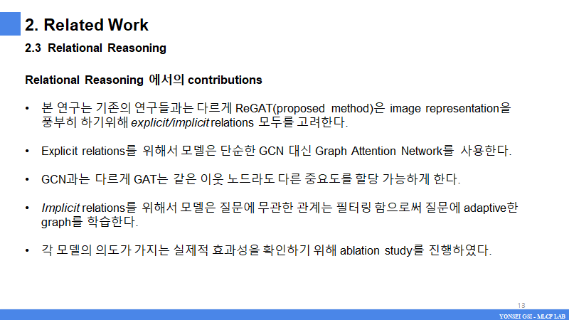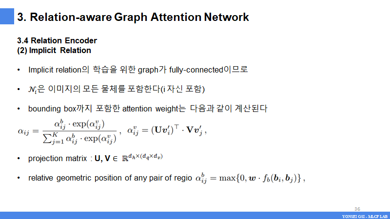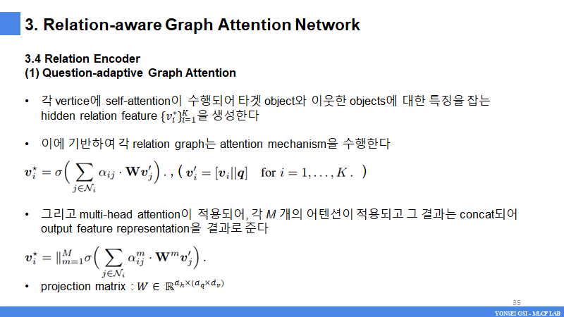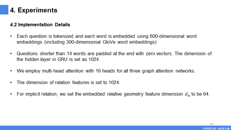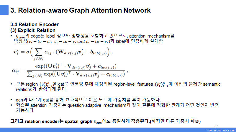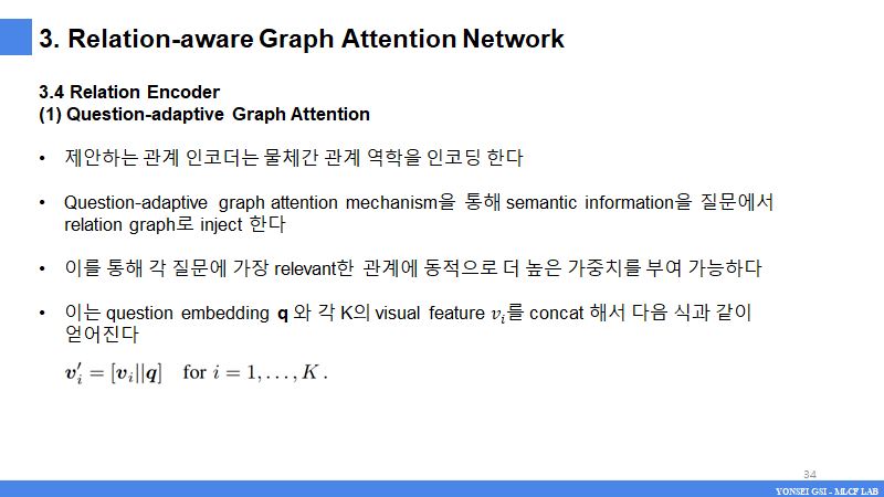 - 각 리전의 합성곱 피쳐와 바운딩 박스 피쳐가 relation encoder에 입력되어 relation aware하고 question adaptive한 region level representation을 학습하게 합니다.