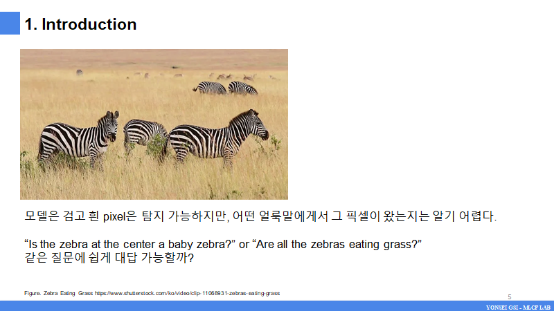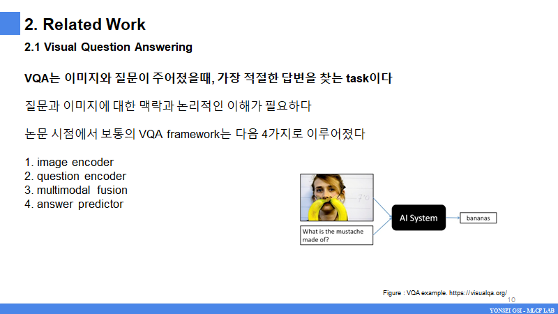 - 따라서 VQA 시스템은 물체와 주변 상황을 잘 인식할 뿐 아니라 행위에 대한 의미적 요소인 ‘먹는다’ 그리고 위치적 요소 (중앙에 작은 얼룩말이 위치함 등의 정보를 이미지와 질문에서 잘 이해할 수 있어야 합니다.)