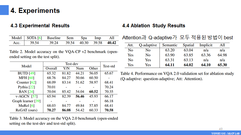 - 그림 4의 3,4 번째 행에서는 question adaptive attention이 적용됨으로서 attention map이 더 예리하게 나타나 더 관련 있는 region을 알게 해주는 것을 보여줍니다