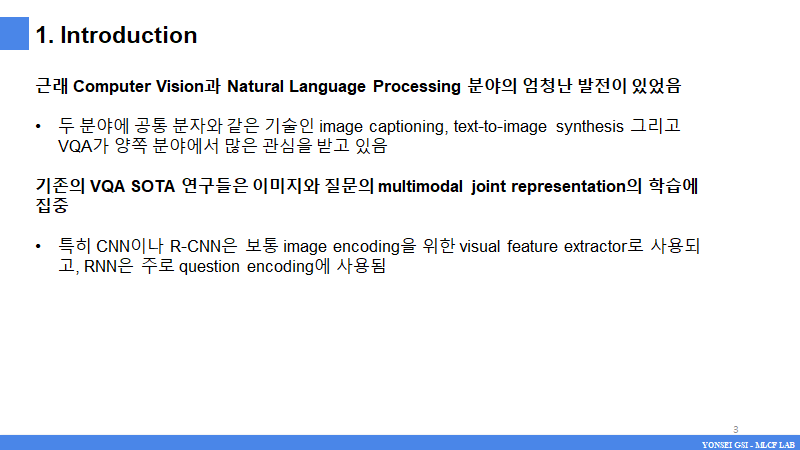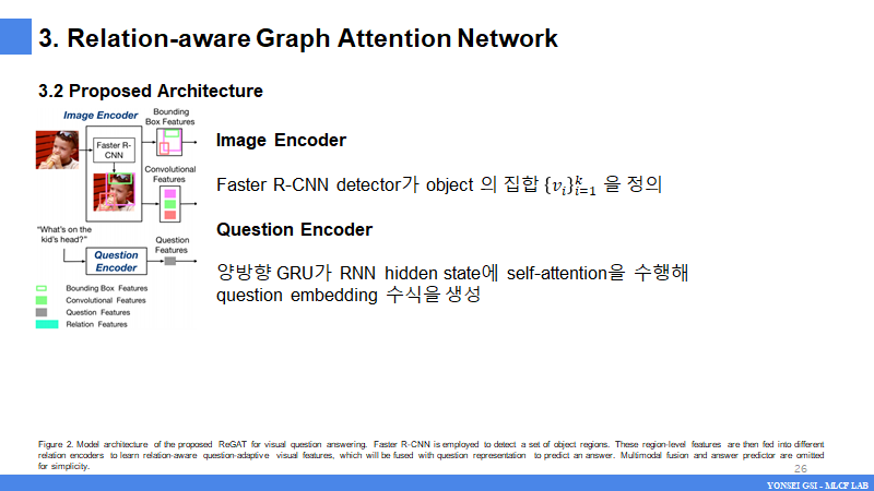 - 그림은 전체적인 모델의 인코더 구조를 보여줍니다. Faster R-CNN로 물체의 region을 생성하고 Question Encoder는 질문을 임베딩 합니다.