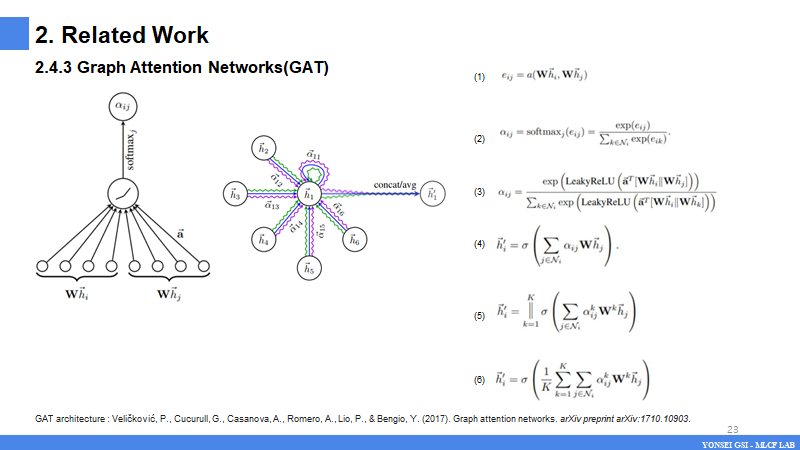 - (1)~(3) 주변 노드에 대해 유사도 비교를 통한 attention score 계산