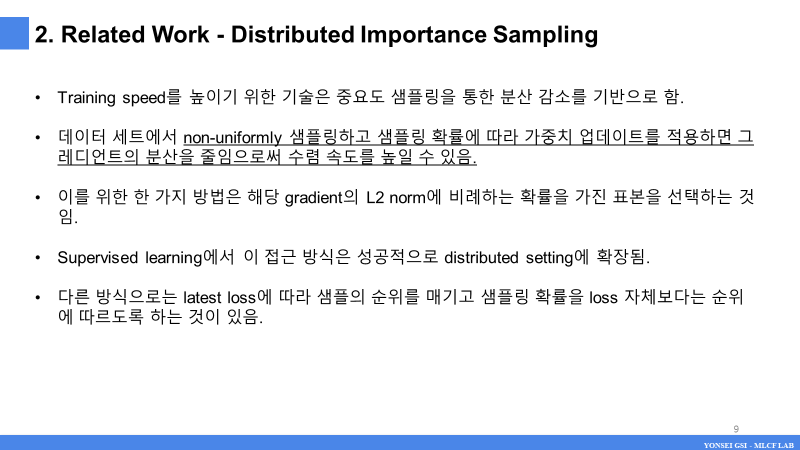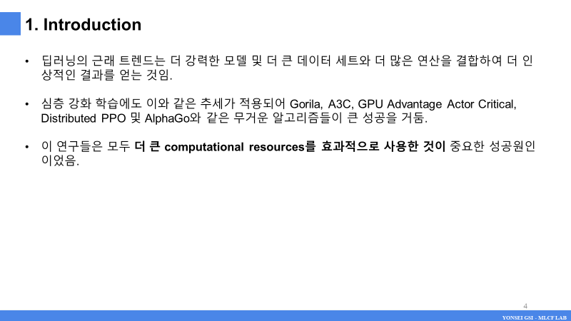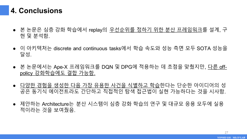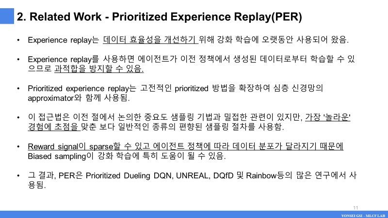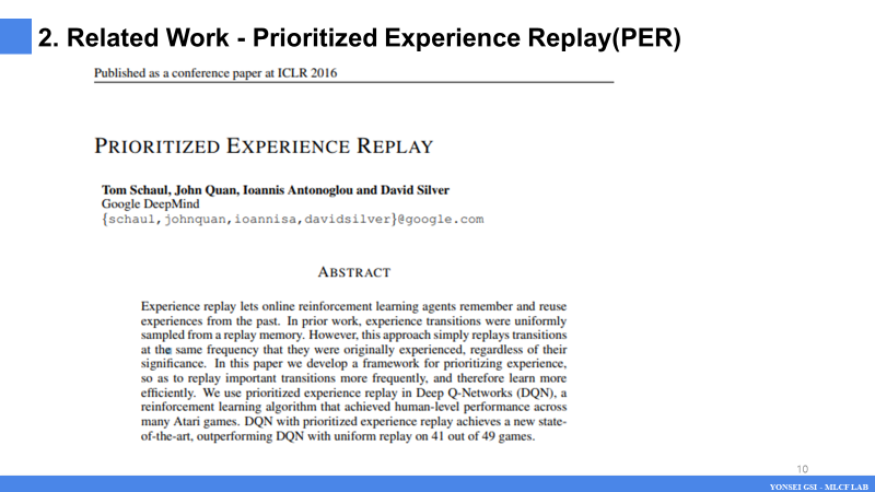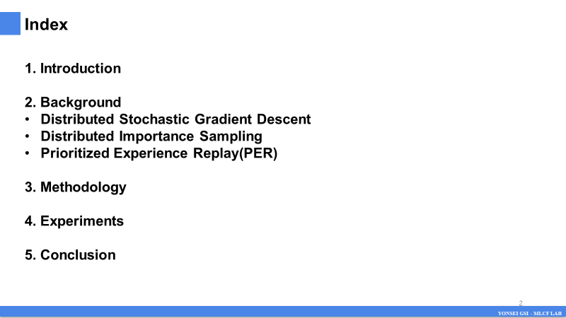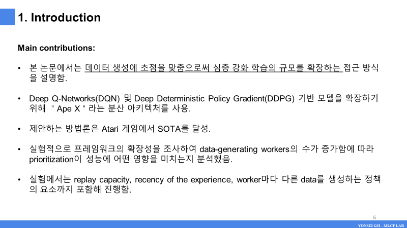 본 논문은 2016년에 딥마인드에서 발표한 PER의 후속 논문으로 기존 PER과 대동소이하지만 제목에서 알 수 있듯이 데이터 분산처리라는 세팅에서 수행되었다는 점이 차이점입니다. 당시의 트렌드가 무거운 모델, 더 많은 데이터를 필요로 함에 따라 적절한 분산 처리를 통해 scalability를 확장하는 것이 중요한 과제였고 그에 따라 위와 같은 연구가 진행되었습니다.