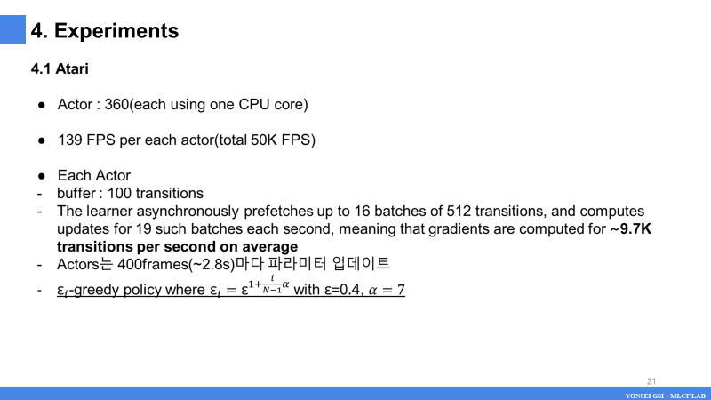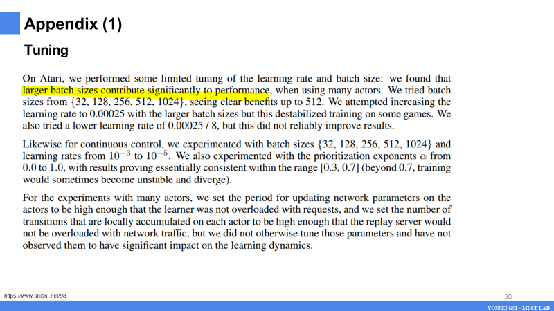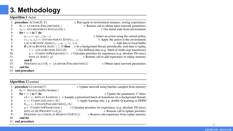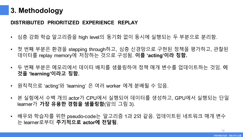 - 그리고 마지막으로 주기적으로 learne의 paramete로 updat 함으로써 2번에서 넣는 priorities가 learner가 계산하는 priorities와 크게 차이 나지 않게 계속 얻어질 수 있다는 점입니다.