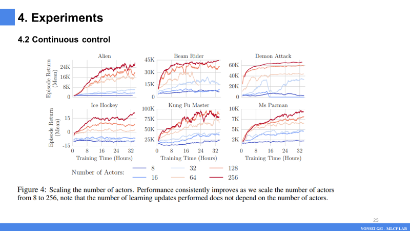 - 단일 Learner는 이 메모리에서 샘플을 추출하여 네트워크 및 메모리에서 경험의 우선 순위를 업데이트합니다.