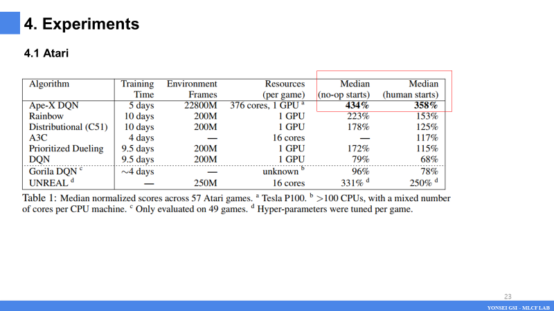 - 표 1에서는 Atari 벤치마크에서 Ape-X DQN의 인간 정규화 성능을 해당 퍼블리케이션 라이선스의 다른 기준 에이전트에 대해 보고된 해당 메트릭과 비교합니다.