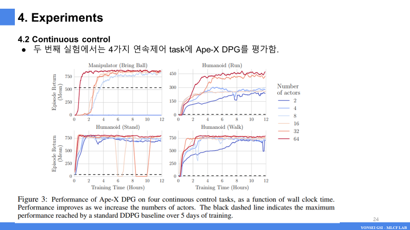 - 그림에는 다양한 actor 수에 대한 Ape-X DPG의 성능이 나와 있습니다.