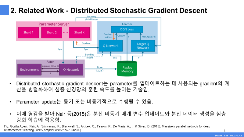 - 동시에, 독립된 actor는 병렬로 경험을 축적하고 매개변수 서버에서 Q-네트워크를 업데이트할 수도 있습니다.